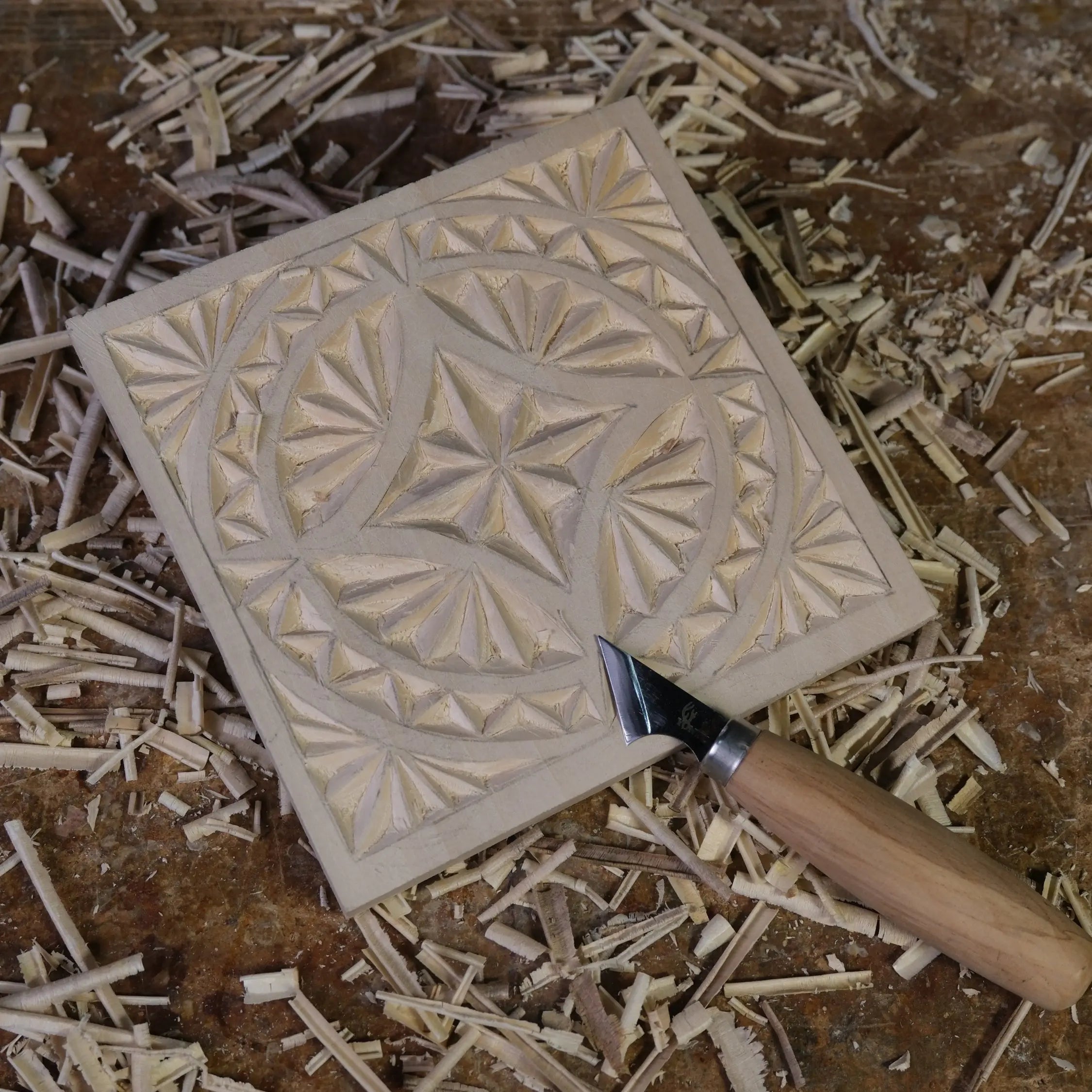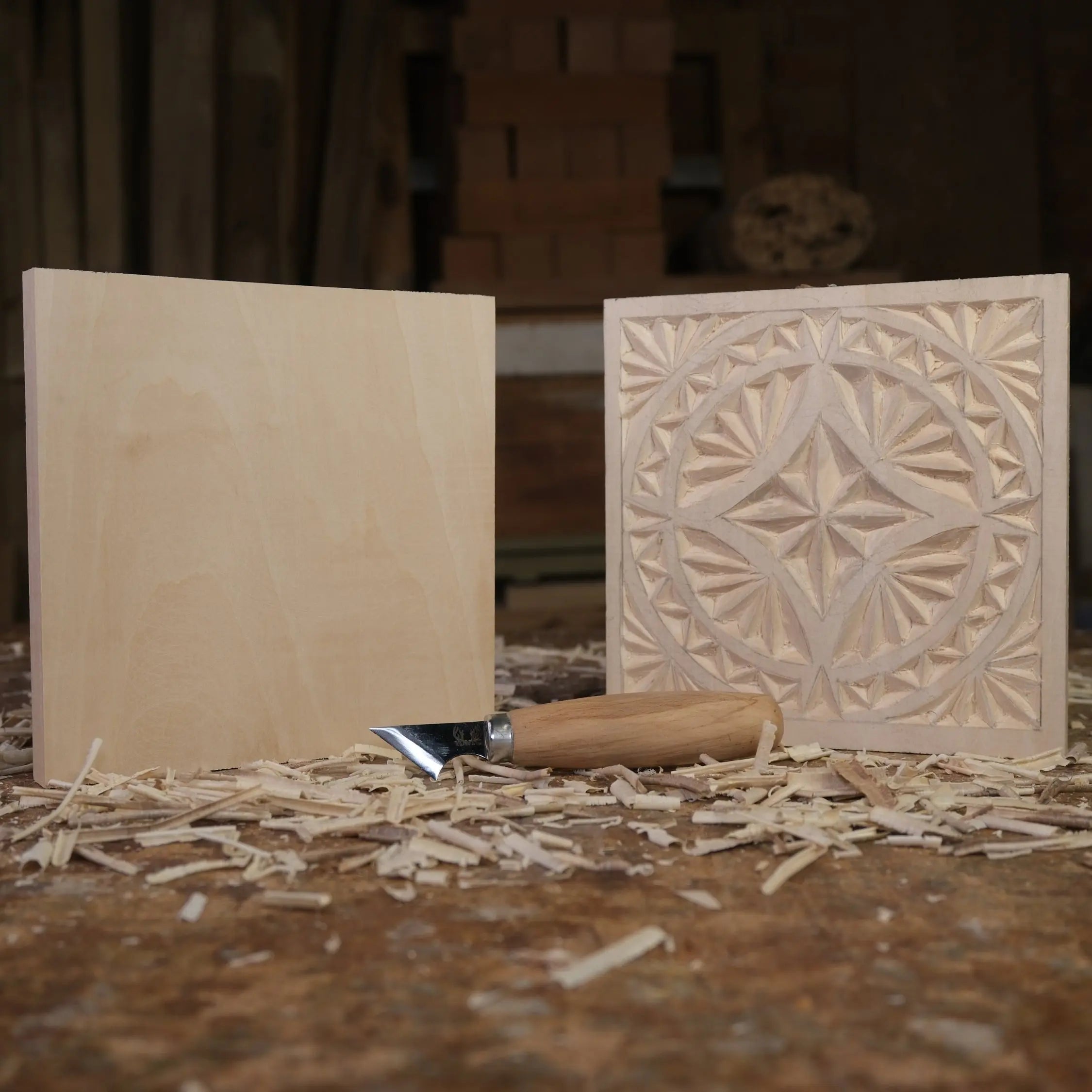 Geleneksel çentik oyma (chip carving) tekniğini öğrenmek için ideal başlangıç seti. Budaksız, premium ıhlamur plaka ile net ve temiz kesikler; karbon kâğıt ve şablonla zahmetsiz desen aktarımı.